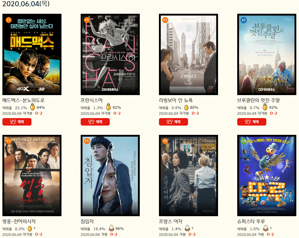 다음은 6월 4일(목) 기준 상영예정작 리스트입니다. 저는 재개봉하는 영웅:천하의 시작이나 김무열, 송지효 주연의 침입자를 볼까 합니다.